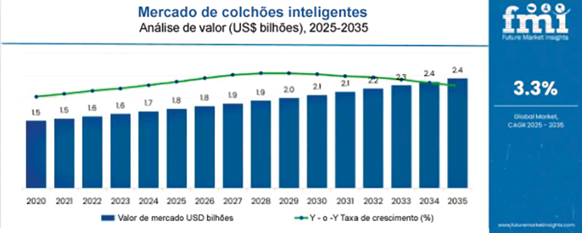 Apesar disso, o mercado segue em expansão constante. Segundo dados dos sites Grand View Research e Future Market Insights, o tamanho do mercado global de colchões inteligentes foi avaliado em US$ 1,7 bilhão em 2023 e a projeção é de crescimento de 3,3% CAGR (taxa de crescimento média anual) entre 2025 e 2035, devendo atingir US$ 2,4 bilhões até 2035.